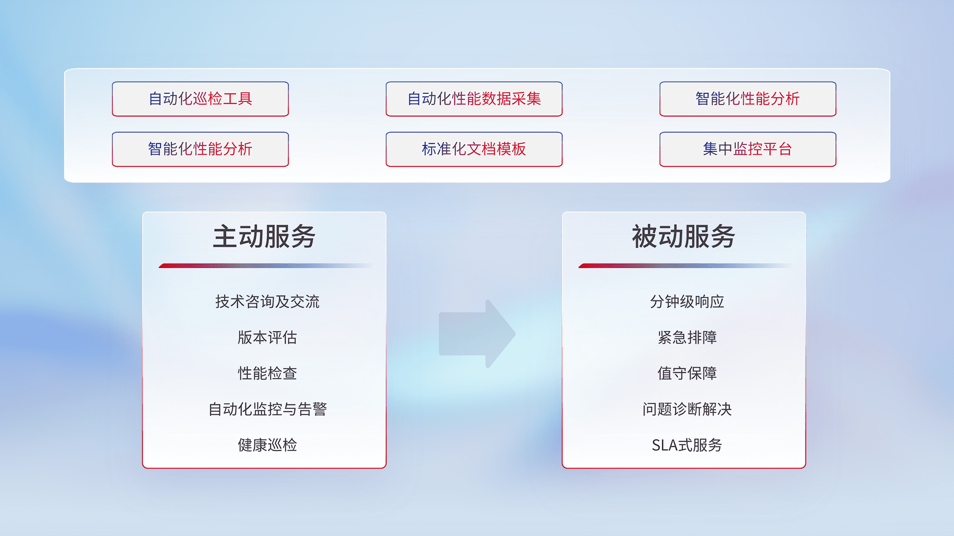 智能化工具和标准化文档,,,保障服务质量,,,,提供主动服务(包含技术咨询、、、版本评估、、、性能检查、、、自动化监控与告警、、健康巡检)和被动服务包含(分钟级响应、、、、紧急排障、、、值守保障、、、问题诊断解决、、、SLA服务)。。。。